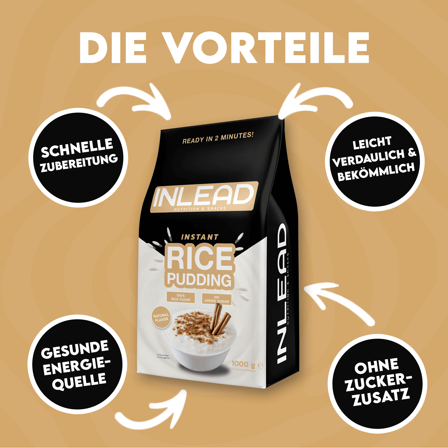 Preperation: Mix 100 g instant rice pudding (2 heaped scoops) with 300 ml hot/cold water or milk and leave to swell for 2 minutes. Tip: For the ultimate taste kick, mix with INLEAD Flavor Powder or INLEAD Whey Protein.
