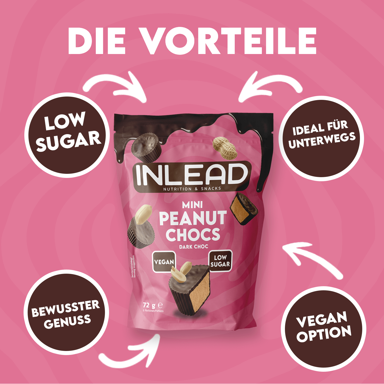 Die INLEAD Mini Peanut Chocs verbinden dunkle Schokolade mit einer zart-cremigen Erdnussfüllung – ein Geschmackserlebnis für bewusste Genießer.