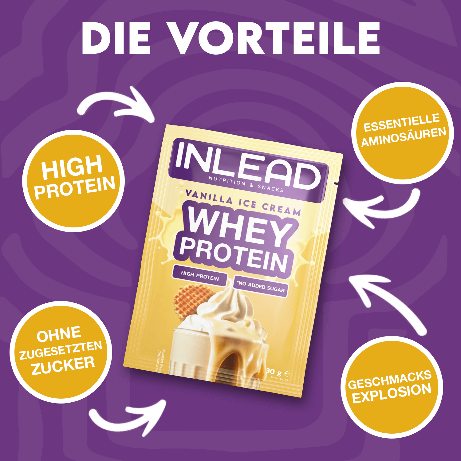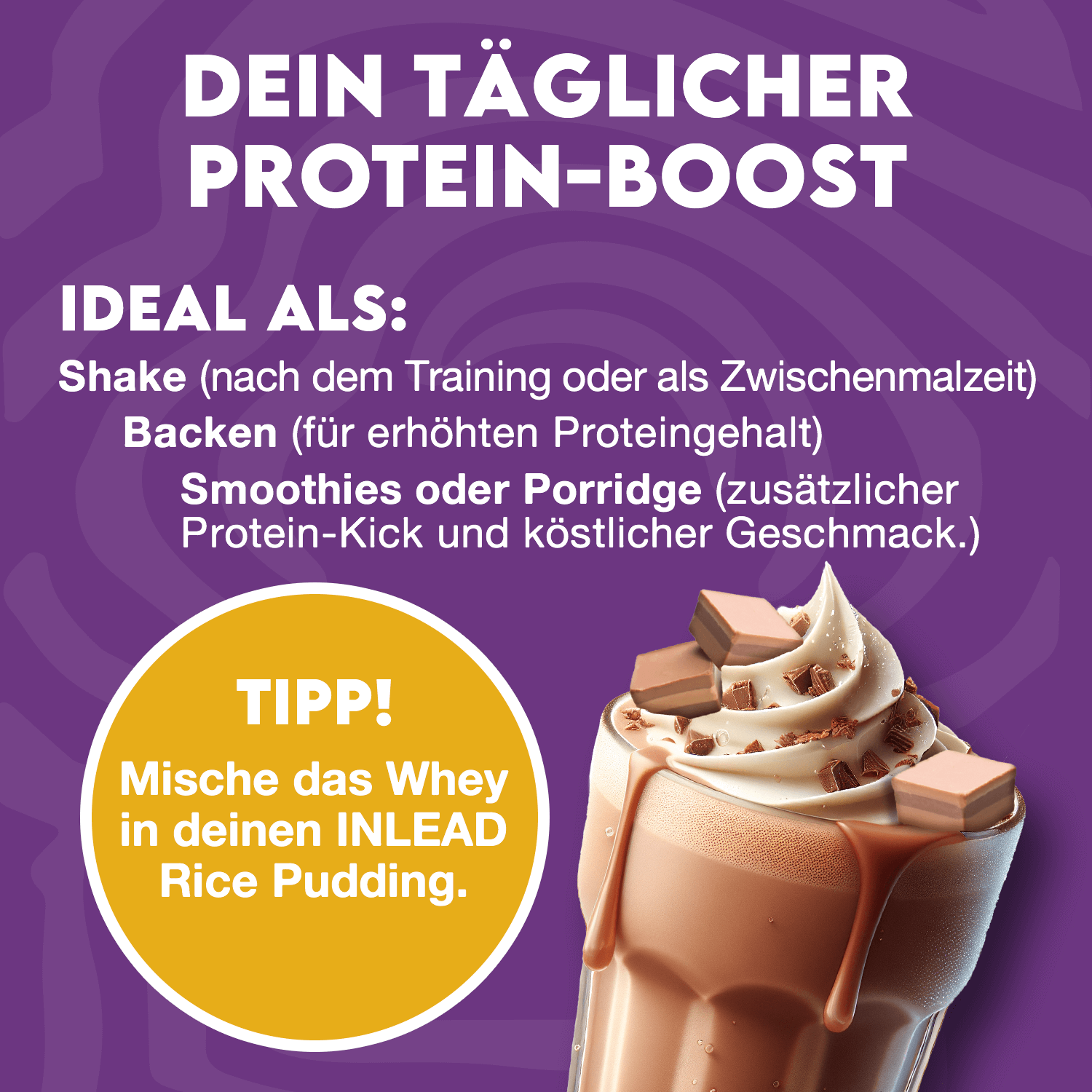 Das INLEAD Whey Protein liefert hochwertigen Eiweißgenuss mit bis zu 23 g Protein pro Portion (30 g).